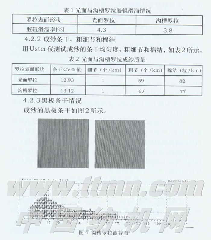 从上述试验结果可以看出:光面罗拉纺纱波普图理想、无机械波、黑板条干好;沟槽罗拉纺纱胶辊滑溜率小;两者条干CV%值、细节、粗节、棉结水平差不多。