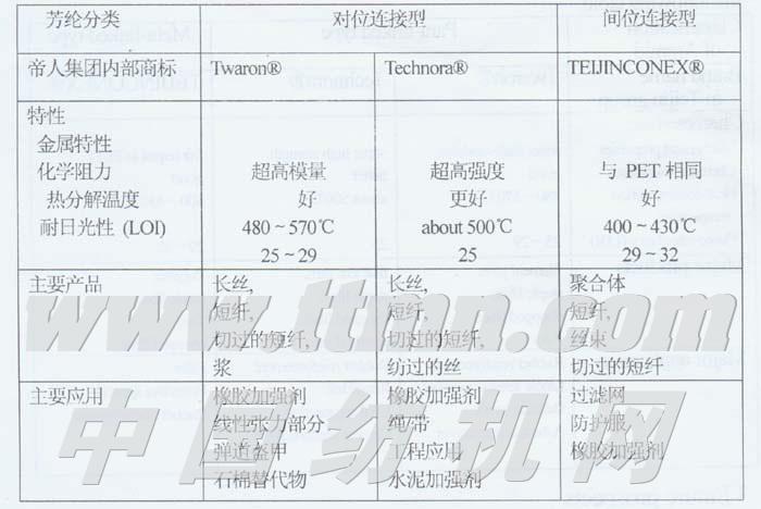 帝人公司生产两种对位连接型的芳纶纤维Technora®和Twaron®,以及间位连接型的TEIJINCONEX®芳纶纤维。