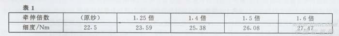 从直观上我们可以看到拉伸后的纱线细度较原纱有明显减小。由表中我们可以看到拉伸1.25倍的纱线细度较原纱细度并无明显降低,而拉伸倍数为1.4、1.5、1.6时纱线细度明显降低。当拉伸倍数为1.6倍时,纱线细度达到2 7.47Nm。但是,试验过程中,当拉伸倍数为1.6倍时,纱线的断头率明显增加会引起效率降低。