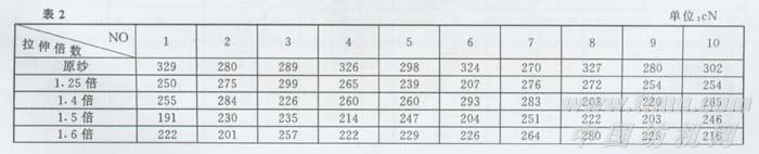 通过比较,纱线拉伸1.2 5倍与拉伸1.4倍的断裂强力没有明显区别,但是当拉伸倍数达到并超1.5倍时.纱线的断裂强力明显降低。因此说明以现有的水平,纱线最高拉伸倍数最好控制在1.5倍以下,否则,对纱线的断裂强力又较明显的影响。