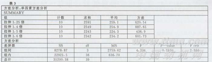 下面利用“方差分析:单因素方差分析”,在显著水平O.05下分析不同拉伸倍数下纱线强力之间有无显著差异(表3)。