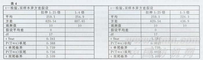 下面比较1.2 5倍与1.4倍1.5倍之间,拉伸倍数对强力是否有显著性影响,在显著水平0.05下用“T一检验”判定(表4):