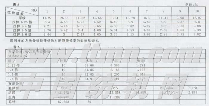 四个拉伸倍数下的纱线的平均断裂伸长率分别为6.36 6、5.1 85、4.205、3.4 9 1;在方差分析表中又给出F统计量1 3.6 68、F临界值2.86 6,F统计量大于F临界值说明拉伸后纱线断裂伸长率之间有显著差异,可以看出随着拉伸倍数的增加断裂伸长率有减少的趋势。