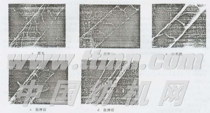 图(e)为山羊绒纤维电镜照片,比较照片b与e,可以看出拉伸一定型羊毛有“羊绒化”的趋势。