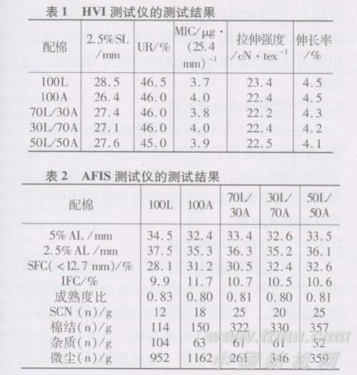 本文中的缩略语解释:SL指纤维的跨距长度;AL指用AFIS测试的纤维长度;A指ANKUR棉纤维;L指LRA棉纤维;UR指纤维的整齐度比;MIC指马克隆值;IFC指未成熟纤维含量;SCN指棉籽壳数;SFC指短纤维含量;RKM指断裂长度;IPI指纱疵仪所测的纱疵总数。