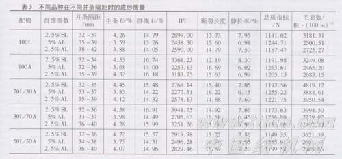 表3为不同品种在不同并条隔距时成纱质量的测试结果。从表3可以看出:5%AL并条隔距生产的不同混纺比例的棉条的U值均低于2.5%AL并条隔距生产的棉条的U值。有关人士曾证明:生条的不匀取决于纤维彼此之间滑移的方式,纤维的运动取决于并条隔距。如果并条隔距小,纤维有可能断裂;另一方面,如果并条隔距足够大,则纤维成为浮游纤维。因此,为了准确控制纤维的运动,必须优选并条隔距,从而使成纱的U值降低。采用5%AL的并条隔距有可能是优化了的并条隔距。