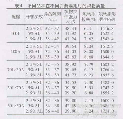 表4为不同品种在不同并条隔距时织物质量的测试结果。