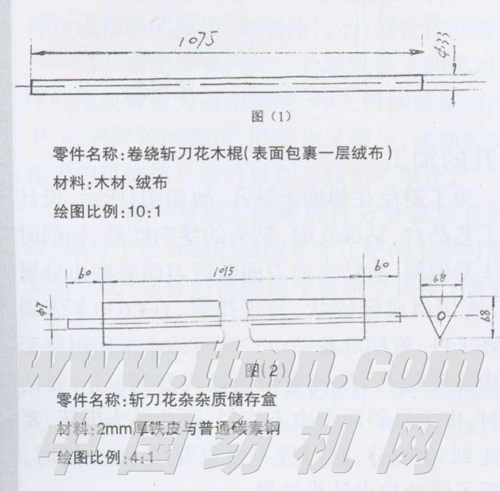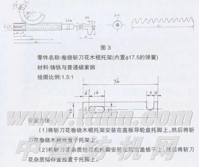 长期以来,梳棉斩刀花散落在前罩板上,挡车工处理斩刀花时散散落落,极度易落入棉网,引起生条重不匀指标波动,形成纱疵,而且处理斩刀花时工作量较大,影响车台清洁。为此工程技术人员想出了解决斩刀花的办法,就是在梳棉盖板下安装一套装置将斩刀花卷绕上去,使斩刀花比较紧密的卷绕在该装置上,这样斩刀花就不会散落在前罩板上。经过一段时间运转,挡车工将包裹在该装置的斩刀花取下来,放入塑料篓,这时无斩刀花散落下来,避免了斩刀花落入棉网引起纱疵及罩板不清洁的弊端,提高了棉网一类率、生条条干与生条重不匀合格率等指标,为后道半制器与成纱质量的提高提供了保证。