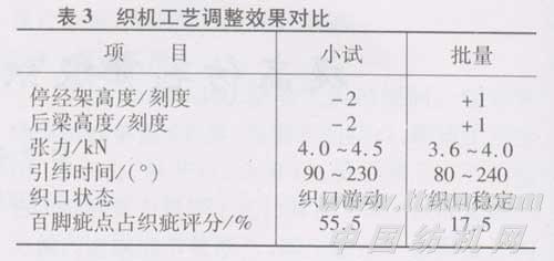 在小批量生产时,出现问断性无规律的百脚疵点。在织机上观察时又不易遇见,值车工查布面时也不易发现。初始分析认为是探纬器不起作用或不够灵敏,曾更换不同探纬器和设置不同灵敏度,但效果仍不理想。通过对生产机台长期跟踪观察,发现断纬后所断纬纱能正常到达探纬器,而织口中缺半幅纬纱或仅在出口侧缺少量纬纱。为此采取改变引纬时间,即由原来的90℃~230℃调整为80°~240°。这样可使引纬气压降低,既能使纬纱正常到达不出现纬缩疵点,又能减少吹断弱捻处纬纱,从而有效地减少了百脚疵布。织造工艺调整后效果对比见表3。