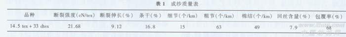 2.5.2 工艺特点 在保证细纱车间合适而稳定的温湿度和良好设备状态下,采用“低速度、小钢领、中捻度、大隔距、小后区牵伸”工艺原则,能降低断头率和提高包芯纱质量。选择薄弓形钢丝圈,能减少摩擦所产生的静电,改善包芯纱的张力和伸长率,减少断头率;前罗拉速度和锭速不宜过高,以免产生断丝现象,一般控制在10 000~11.500 r/min之间。由于在纺纱过程中气圈张力偏大,气圈凸形增大,所以在选择钢丝圈时,既要考虑克服气圈张力,又要保证紧密的卷绕,钢丝圈要偏重掌握。涤纶无弹力长丝在包芯纱中有助于增强成纱的强力,能增加与Modal纤维的抱合力,所以在选择捻系数时应偏小掌握,以提高成纱断裂强度和包覆效果。适当增加长丝的预加张力,能提高断裂强度和断裂伸长及提高包覆效果。合理选择导丝轮装置,防止涤纶长丝跑偏,使涤纶长丝定位喂入前罗拉钳口。同时调节好导丝轮位置,把涤纶长丝调整到前罗拉钳口粗纱须条的中心,以保证包覆效果。细纱机罗拉隔距偏大掌握,适当增加加压量。提高外包纤维量,能提高包芯纱的强力和耐磨性。保证设备运转状态良好,可提高包芯纱的包覆质量,减少“包缠、赤膊”等露芯现象。好的设备状态是最基本的生产条件,必须保证涤纶长丝从前钳口输出时与包覆的Modal纤维形成一体,不能分流。在生产中要严格按操作法生产并严格执行清洁要求,防止因清洁不良或不按操作法操作而造成飞花性竹节纱。同时要加强巡回检查,发现“露丝”现象,要及时处理,不良涤纶长丝要扯掉,要经常检查涤纶长丝导丝轮的灵活转动情况,防止钩断丝芯。一般纺s捻纱时,涤纶长丝输出位置在外包纤维须条中心线的右侧;纺z捻纱时,在包覆纤维须条的左侧,这样有利于涤纶长丝处于纱芯位置,提高包覆质量。其工艺为:后牵伸倍数为1.30,隔距为20 mm×31 mm,加压为16Kg×10 kg×14 kg/双锭,前罗拉速度为152r/min,捻度100捻/10 cm。