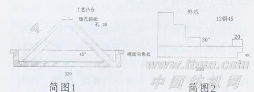 圈条斜管是铸造件,材料为HT300,形状如简图1所示,要求加工后,接触棉条的部位,如Φ38通孔的内表面、端面、倒孔斜面以及它的相交线等都是必须保证不挂花、叮花,也就是要求这些面粗糙度不超过Ra0.8μm。