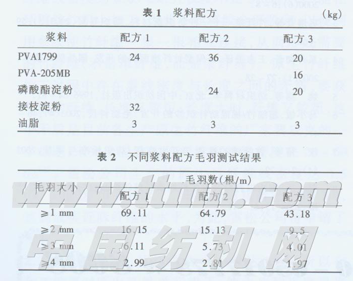 为了减少浆纱毛羽,选用同样的经纱,以同样的总经根数,对一些影响浆纱毛羽的因素进行了如下的研究。