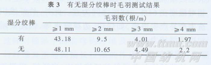 在浆纱工序中,浆纱离开浆槽进入烘房前,一般要经过几根湿分绞棒,分成数层后,平行进入烘房,以便初步形成浆膜后再并合,这样可有效减少烘燥后浆纱之间相互粘连,减少出烘房而进行分绞时的困难,对提高浆膜完整率,降低再生毛羽都极为有利。对13 texT65/C35经纱在GA301型浆纱机上分别进行有和无湿分绞棒上浆,用毛羽测试仪对浆纱毛羽进行检测,测试结果见表3。