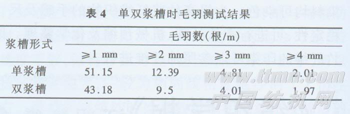 对13 texT65/C35经纱分别在单槽浆纱机G146B和双槽浆纱机GA301上进行上浆,用毛羽测试仪对浆纱毛羽进行检测,其测试结果见表4。