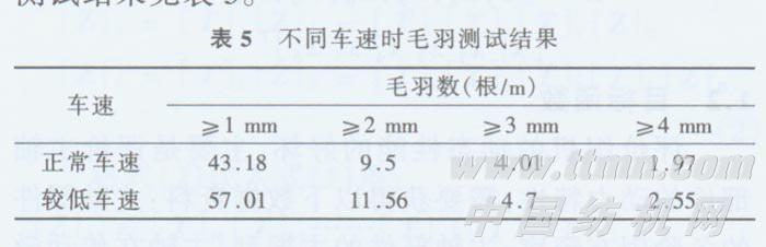 根据牛顿第一定律,F是浆液对纱身的作用力,伸出纱身的毛羽也受到这个力F的作用。正是这个力F的作用使伸出纱身的毛羽贴向纱身,从而使毛羽减少。当浆纱车速逐渐降低时,纱线与近纱线的浆液速度差dv会减小,作用力F减小,对毛羽的作用力也减小,故毛羽增多。对13 texT65/C35经纱在GA301型浆纱机上分别在正常车速和较低车速时进行上浆,用毛羽测试仪对浆纱毛羽进行检测,其测试结果见表5。