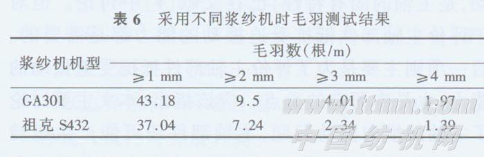 对13 tex T65/C35经纱分别在祖克S432型和GA301型2种浆纱机上进行上浆,用毛羽测试仪对浆纱毛羽进行检测,其测试结果见表6。