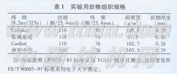 实验用织物试样设计为平纹机织物。其中经纱均为锦纶纱,织物组织规格和所用纬纱见表1。