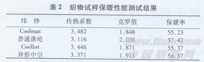 3.1.1中空异形涤纶织物的保暖机理及测试结果 理论认为,在面料中保持相对静止的空气量越多,保暖能越好。但是空气对辐射热几乎没有阻挡作用,而纤维却能有效阻挡。因此,理想的保暖效果需要选择合适的纤维并保持面料中较多的静态空气含量。要达到这一目的,采用截面中空纤维来储存空气,并采用空气层组织是一种有效的途径。