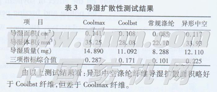 由以上测试结果看:异形中空涤纶纤维导湿扩散面积略好于Coolbst纤维,但差于Coolmax纤维。