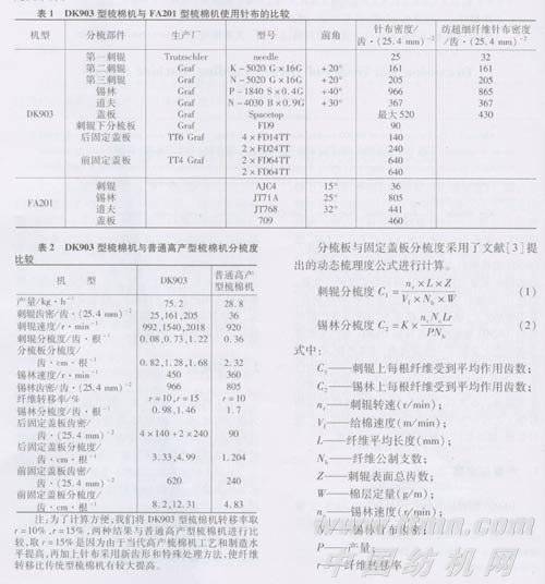 从表1中可看出,DK903型梳棉机所选用的是公认为世界一流的Graf针布,其配套方式也采用Graf配套设计思想。