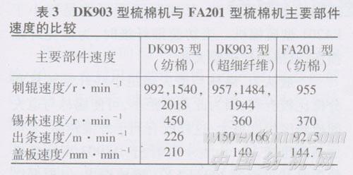 DK903型梳棉机纺棉和超细纤维、FA201型梳棉机纺棉时主要部件的速度情况见表3。