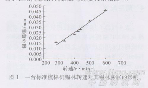 DK903型梳棉机在产量高的情况下,其隔距仍比DK760型梳棉机要小DK760型梳棉机纺棉为0.25 mm,0.23 mm,0.20 mm,0.20 mm)。从表4数据可以看出,DK903型梳棉机与FA201型梳棉机相比要大一些,但其实际运行隔距却相差不大。分析如下:当锡林高速时,因离心力等原因会引起滚筒膨胀,其膨胀与速度关系见图l。