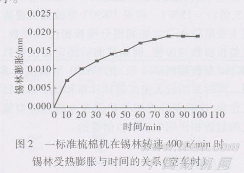 根据图1可以看出,当锡林转速为360 r/min时,锡林膨胀约为0.02 mm,而450 r/min约为0.03 mm,故DK903型梳棉机因滚筒膨胀而导致的实际隔距为0.20 mm,0.20 mm,0.20 mm,0.17mm,0.17mm,0.17 mm。FA201型梳棉机实际隔距为O.21 mm,O.18 mm,0.16 mm,0.16 mm,0.18mm。另外,当锡林加速时,因受热也可引起滚筒膨胀,其膨胀与时间关系见图2。值得注意的是图2是在空车时梳理受热膨导致隔距变化,可以推断如有纤维生产、高产、锡林速度高时,因受热膨胀而引起滚筒隔距变小情况要比低产低速时数值要更大一些,因为此时纤维与针布滚筒、纤维与纤维间摩擦作用都比较大一些。这种情况在隔距小时尤为严重,这是由于当隔距小时,锡林受热升温膨胀情况加剧,导致隔距变小;隔距变小,又会使升温进一步加剧,锡林进一步膨胀,隔距进一步变小。