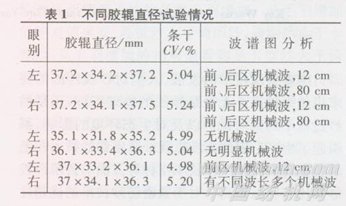 我公司在纺制涤棉府绸品种用纱时,其成纱质量一直处于不稳定状态,布面阴影严重,严重影响织物质量。通过深入细致分析,查找原因,发现问题主要出现在并条工序。试验发现FA304型并条机二并的波谱图都有严重的机械波,经过设备维修、检查罗拉动平衡、胶辊平行度、圆整度、表面光洁度后开车试纺机械波仍未消除。为了进一步找出出现机械波的原因,我们又对二并的条干CV值进行了测试,同时进行波谱图试验,发现胶辊直径为37 mm×34 mm×37 mm的并条机条干CV值较大,波谱波图反映前区有严重的机械波,而胶辊直径为35 mm×32 mm×35 mm的并条机条干CV值较小,前区无机械波、后区机械波不明显。