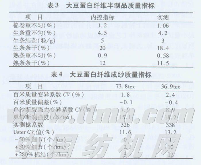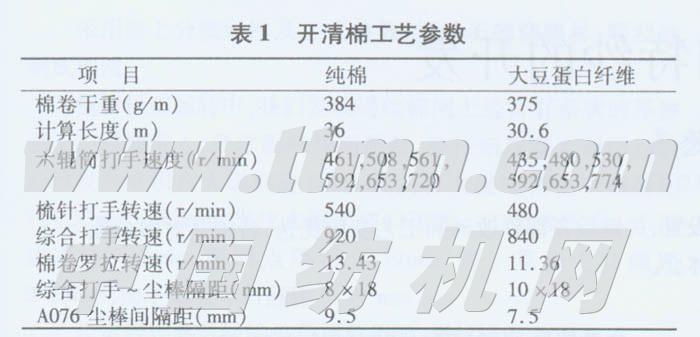 由于有静电现象,开清棉还要重点解决好成卷时的粘卷问题n粘卷严重时,在梳棉喂入退解时层次不清,成片粘剥,严重影响生条质量(重不匀)。后来通过使用凹凸罗拉、增大紧压罗拉压力、采用环锭纺同规格大豆蛋白纤维原料的粗纱做夹层、减轻棉卷定量、降低棉卷罗拉转速等措施,使梳棉退绕时粘卷问题有了明显的改善。为防止油剂的挥发,落卷后每只棉卷都用塑料薄膜包好,梳棉随用随取。与原流程中纯棉开清工艺参数对比情况见表1。