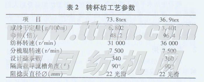 经过不断分析和反复调试,认为造成以上问题有两方面原因,一是由于纤维长度长,活络通道纤维出口与隔离盘导流槽凹口(纤维喂人点)之间的距离过小,应调大,导流槽角度由45°调为90°,可减少骑跨纤维、缠绕纤维的产生;二是因为采用刻槽阻捻头,须条与阻捻头之间的摩擦阻力大,使须条产生剧烈抖动,回转运行不稳定,而且剥聚点和喂入点之间须条假捻的退捻作用易向外传递,使得纱条结构松弛,强力下降,断头增多,纱线表面毛羽、小棉球增多,应改用光滑型阻捻头。改进后毛羽、小棉球多的问题得到了基本解决。转杯纺有关工艺参数见表2。
