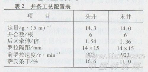 采用轻定量、慢速度、两道并合。为改善条干不匀,胶辊表面用树脂涂层处理。