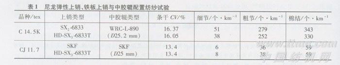 指出了铁板上销和中铁辊在纺纱中存在的弊端,分析了尼龙弹性上销和中胶辊改善成纱质量的机量。纺纱试验表明,尼龙弹性上销与高硬度中胶辊配套纺纱,成纱质量明显改善。