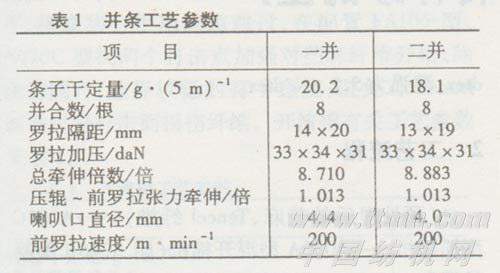 并条工序采取“大隔距、重加压、多并合、大后区牵伸倍数”的工艺原则。并条胶辊采用抗静电作用良好的涂料处理,防止缠罗拉绕胶辊现象。为充分提高纤维的伸直度和平行度,采用“头小二大”的顺牵伸,头并后牵伸倍数配置较二并大,总牵伸倍数大于并合数;同时加大胶辊压力,减少前压辊的张力牵伸倍数。其具体工艺参数配置见表1。