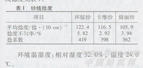 试样:11.7 tex长绒棉与细绒棉混纺的精梳环锭纱、卡摩纱和倚丽纱(配棉比基本相同)。纱线捻度见表1。
