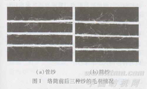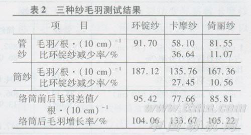 紧密纺纱较环锭纺纱毛羽少,纤维在纱中的伸直平行度有了大大改善,这是传统环锭纺纱技术的一大改进。但在生产实践中发现,紧密纱经络筒后再生毛羽比较严重,对于这一问题大家非常关注。因此,我们测试分析了卡摩纱、倚丽纱与传统环锭纱毛羽之间实际存在的差异。
