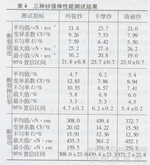 环锭纱、卡摩纱与倚丽纱的强伸性能测试结果见表4。