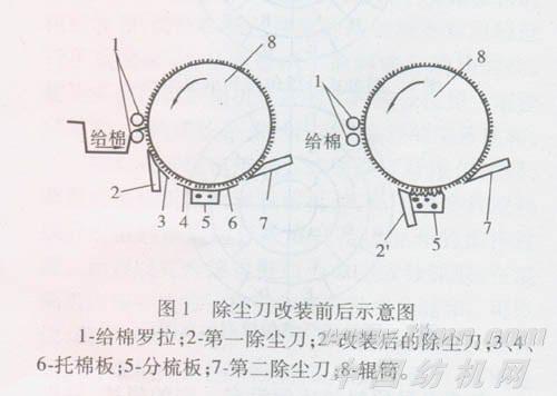 我厂的清梳联机组除杂效率很低,对半制品生条棉结、杂质质量影响较大。为此,我们进行了多次落棉试验,发现FA108E型锯齿辊筒开棉机除杂效率低,所以对其除尘刀进行了改进。