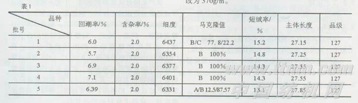 彩色棉花是一种具有天然色彩的棉花变异品种,其物理指标与白棉比较:纤维的长度偏短,一般在26mm左右,短绒含量高,棕色棉成熟度较好,但不孕子较多,籽屑、叶片多、含杂较高,一般彩棉1级棉接近白棉3级的有关质量指标。5批彩色棉花质量检验指标见表1。