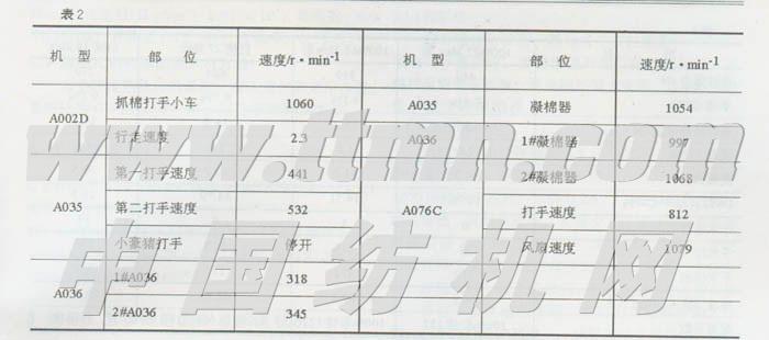 A076C综合打手将打手刀片摘除,只用梳针打手起作用,各主要机械速度见表2。