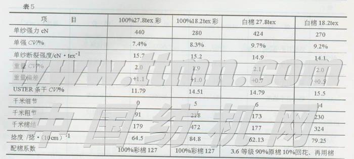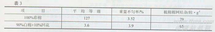 平均配棉等级为3.6白棉纺27.8tex与配棉127的100%彩棉纺27.8tex质量对比数据见表3。