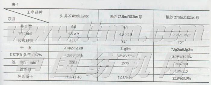 彩色棉纤维纤维短,纤维之间抱合力差,短绒高,为有效控制纤维,提高纤维的伸直度和分离度,改善条子的长、中片段均匀度,针对彩棉纤维特点,调整并条工序并合数、罗拉隔距、降低罗拉速度,其工艺见表4。