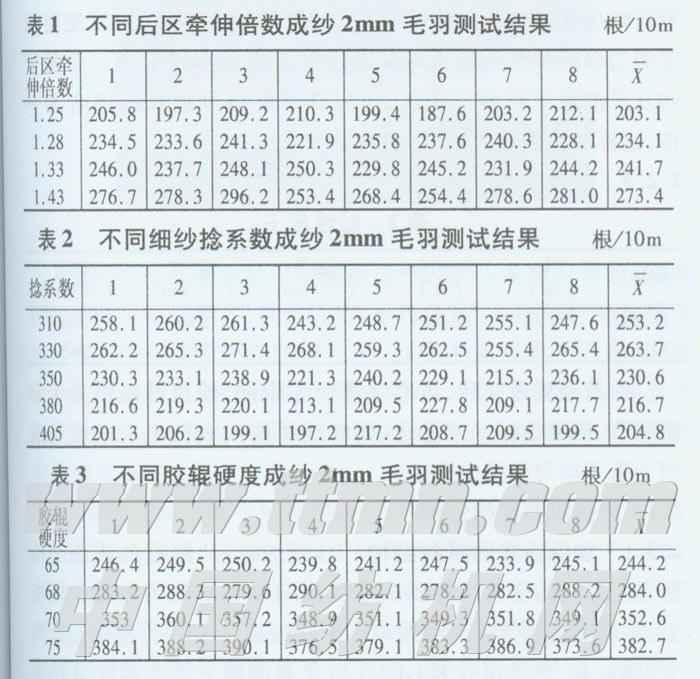 主要研究了FA502型细纱机纺纱时,后区牵伸倍数、细纱捻系数和皮辊硬度对成纱毛羽的影响。