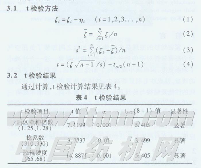 3.3.3胶辊硬度对成纱毛羽的影响 由表3表明,采用硬度较低的胶辊,可使纺得的纱线毛羽明显减少。当胶辊邵氏硬度由75减小为65时,其3mm毛羽数(8个管纱平均数)由382.7减少至249.2根/lOm,减小幅度为34.9%,从表4中t检验结果可知,当胶辊硬度由68降低为65时,成纱2mm毛羽数有显著差异。由此可见,降低胶辊的硬度对减少成纱毛羽是非常有效的。因为软胶辊具有弹性好,表面变形大,使前罗拉钳口对须条的握持性能增强,横向握持均匀,对须条的边缘纤维控制能力强,这样有利于减少纤维的散失,减少飞花,从而有利于改善成纱毛羽。