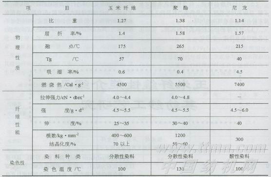 玉米纤维与聚酯和尼龙纤维的性能比较见表1