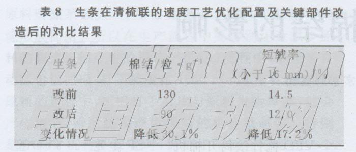 在清梳联针布使用二年半不更换的条件下,以CJ14.6 tex品种为例,经对速度工艺优化配置及关键部件的改造后,生条中的棉结可控制在90粒/g,短绒率可控制在12%左右。
