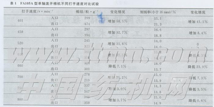 针对本机对纤维的强化处理是在自由状态下均匀密集的多次弹打,做到开松过程中除杂,在除杂过程中逐步开松,对重点部位打手速度分档调整,对比试验结果见表1(AFIS测试仪)。