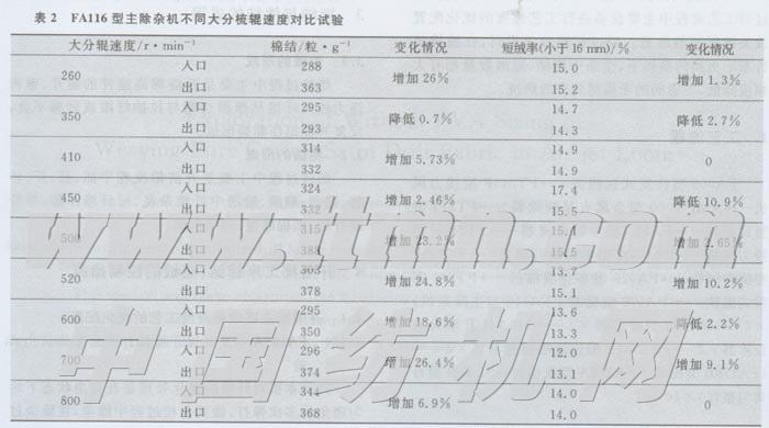 在不影响本机的开松、除杂作用的情况下,为做到棉结、短绒数量的控制,对关键部件中大分梳辊的速度分档调整对比试验结果见表2(AFIS测试仪)。