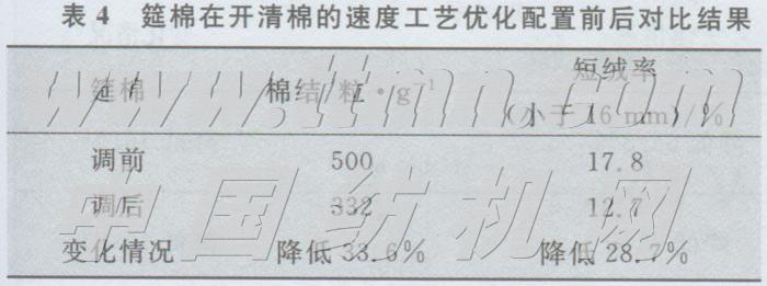 经过大量分析整理,同机筵棉在开清棉工艺速度优化配置前后的棉结数量、短绒率的对比数据见表4(AFIS测试仪)。