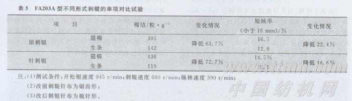 为充分发挥刺辊的梳理、转移作用,将刺辊针布由锯齿形改为梳针形,减小对纤维的损伤。对比结果见表5(AFIS测试仪)。