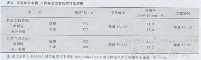 为进一步验证开清棉速度工艺优化配置及开松辊、刺辊改造后对控制生条中的棉结、短绒率的效果,在不同机台有多次测试对比,结果见表6。